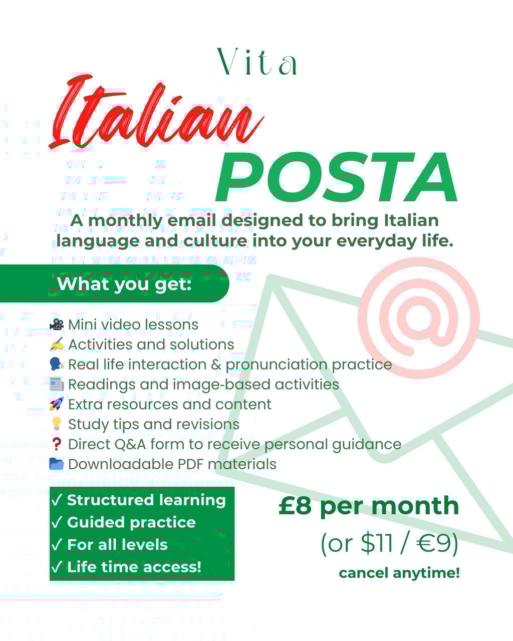 If you have any questions please get in touch info@learnitalianvita.com